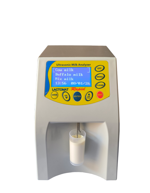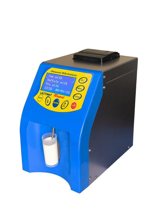 New ultrasonic milk testing machines, Rapid from the Lactomat series are the fastest high-end instruments used for measuring the basic components of the milk. Powered be new generation microprocessor with 20 times more capacity for data processing. Accurate analysis of the components is carried for 18 seconds for sample temperature 28° C and 15 seconds for 38° C . Milk analyzers Lactomat Rapid are compact devices equipped with double measuring cell and inbuilt ventilation system for prevention of overheating in hot environments. Stainless steel and plastic housing.Three calibration channels are available. Standard calibrations for milk analyzer Lactomat Rapid are for Cow milk, Sheep milk, UHT. The analyzer can be calibrated also for: Buffalo milk, Pasteurized milk, Goat milk, Mixed milk(cow 50% buffalo 50%), Skimmed milk, Whey and other types of milk and milk derivatives.